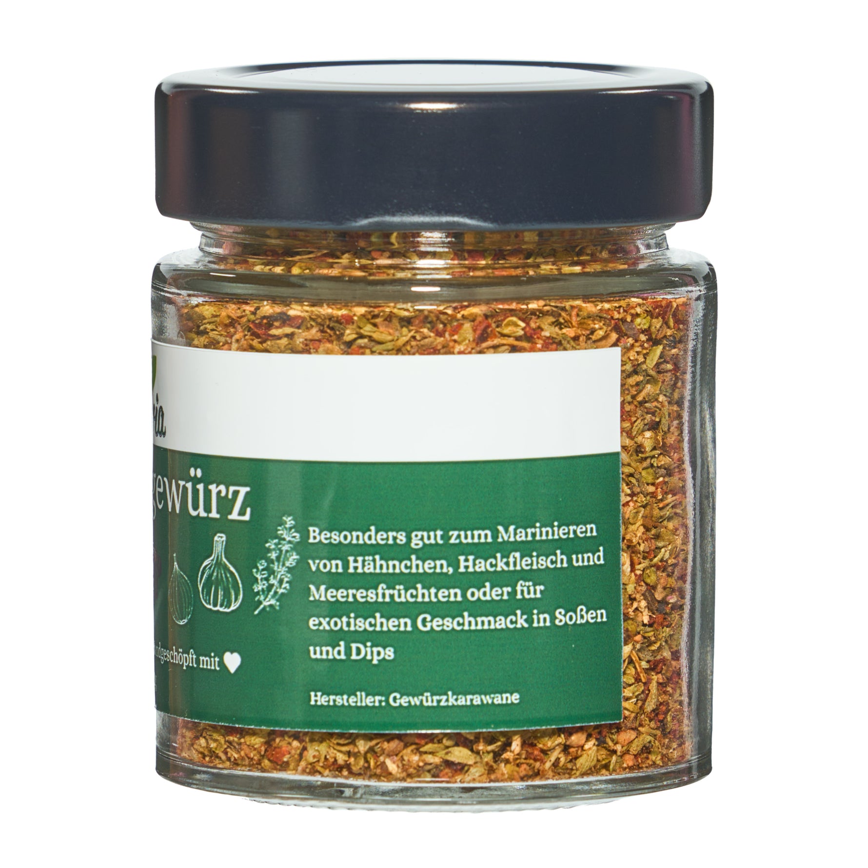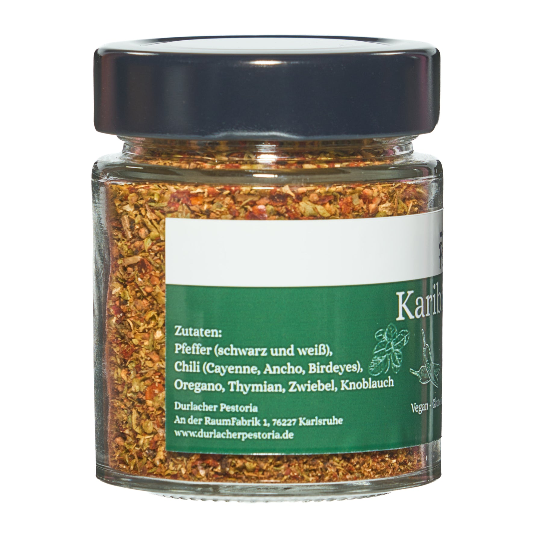 Zutaten: Pfeffer (schwarz und weiß), Chili (Cayenne, Ancho, Birdeyes), Oregano, Thymian, Zwiebel, Knoblauch.